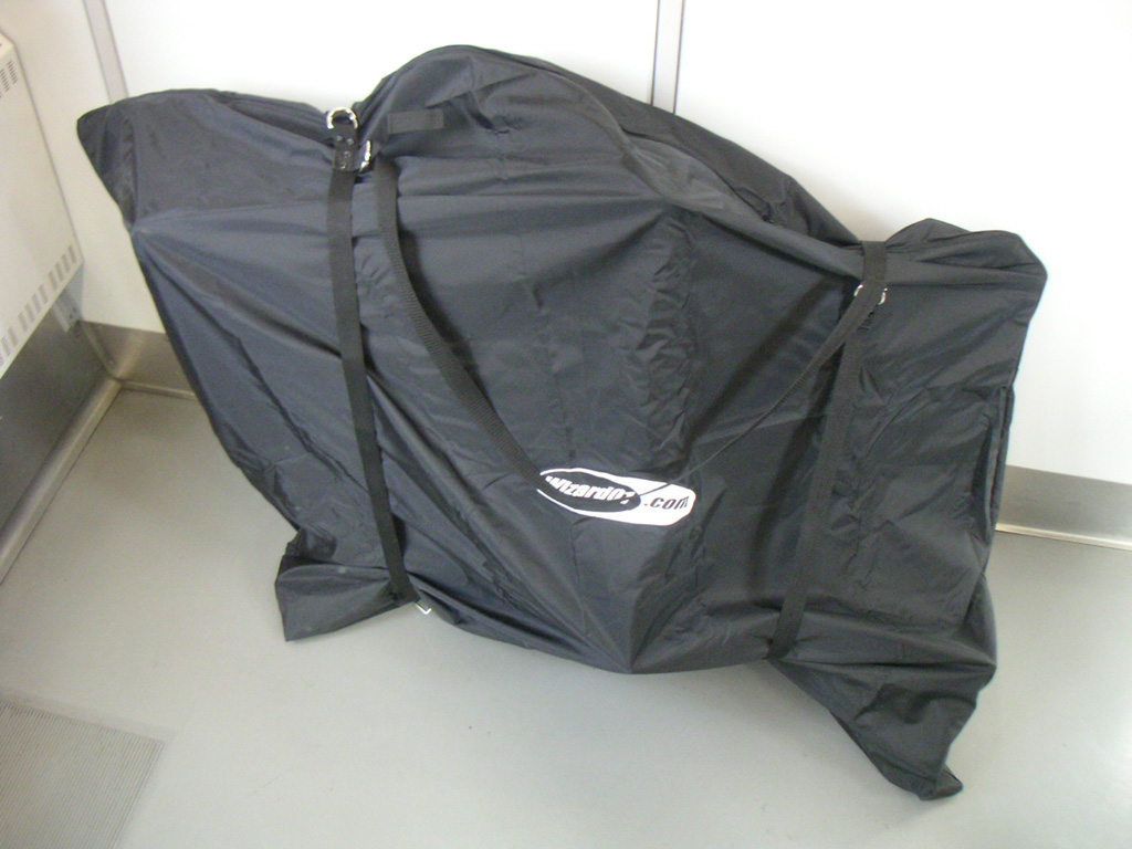 ズバリ敗因はいざ本番で袋の前後を見誤っていたこと。とりあえず二つのジッパーの前方側に付いてる方のスライダーに後で目印を付けておこう。あとホイール固定用の両面ベルクロテープはもう1本ぐらいあった方がよさそうなので、後日ハンズで仕入れてくるよう自分向けメモ。