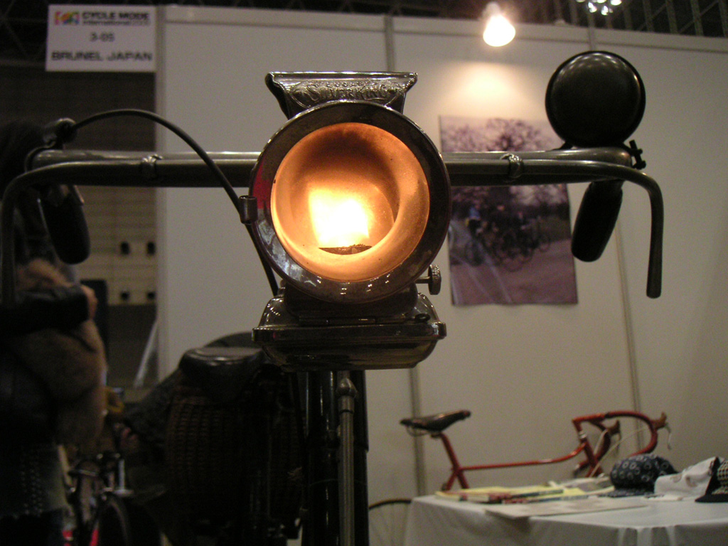 あとはまぁ展示方面で120年前の自転車を再現したものとかちょっと目を引かれたかも。後の実用車に繋がるような無骨な佇まいで、ハンドル前に数付けられていたフロントライトはLEDどころか電球でさえなくて、なんとアルコールランプという代物。独特な金属製の筐体の奥で揺れているオレンジ色の灯がなんとも印象的だった。